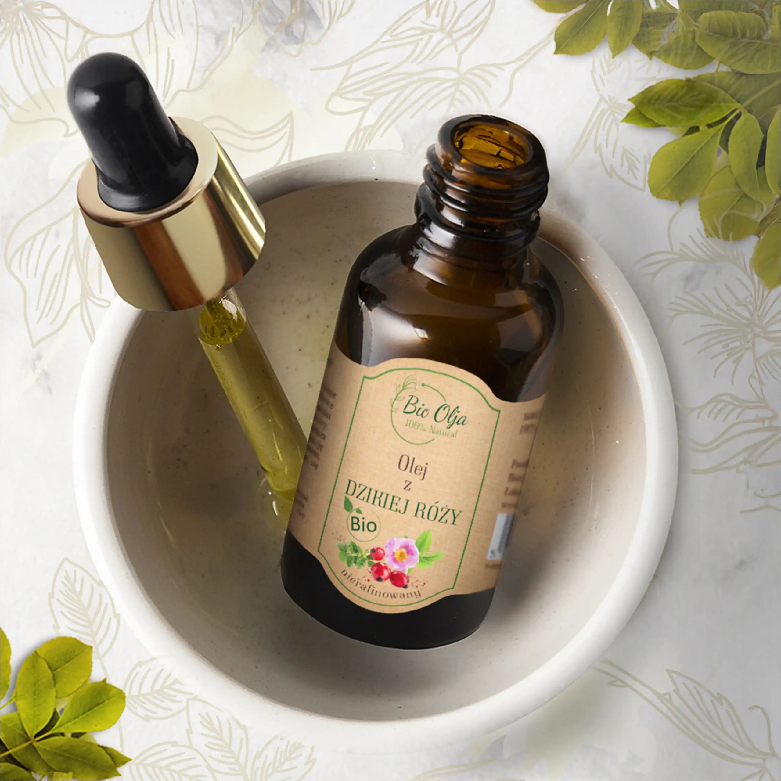 Olej z dzikiej róży to naturalny, tłoczony na zimno i nierafinowany olej bogaty w kwasy tłuszczowe i beta-karoten. Nawilża, wygładza i poprawia elastyczność skóry, redukuje blizny i przebarwienia oraz wspiera regenerację. Chroni przed wolnymi rodnikami i działa antyoksydacyjnie.